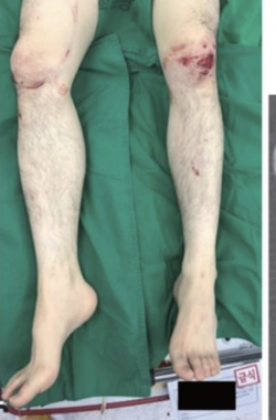 grasp femur above lateral side of knee, flex knee slightly, and pull up sharply on tibia from medial side
