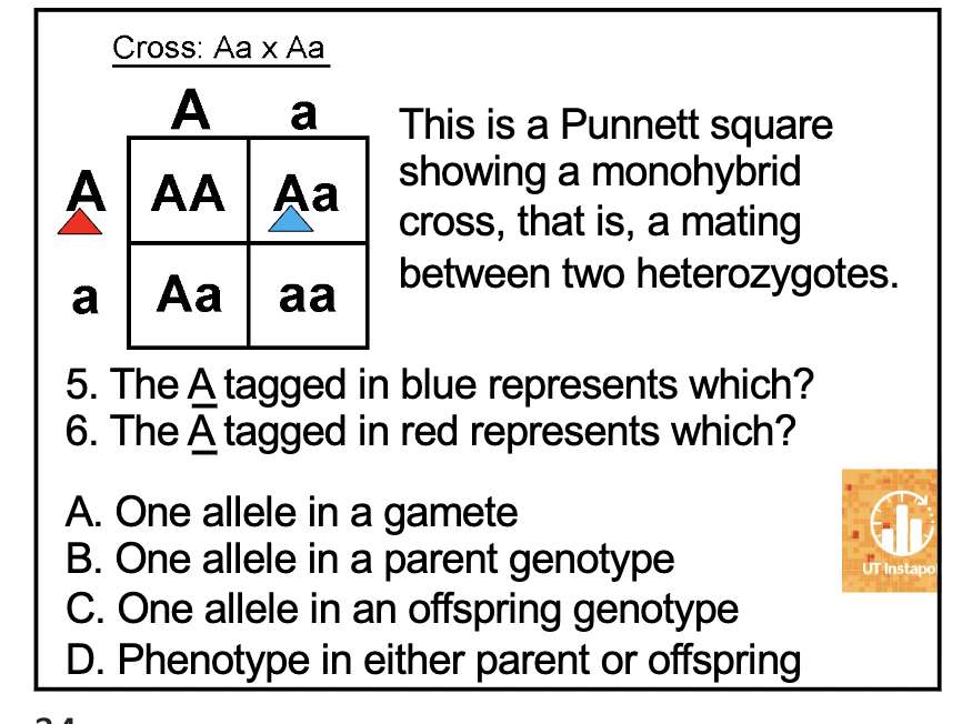 The A tagged in blue represents: C. One allele in an offspring genotype