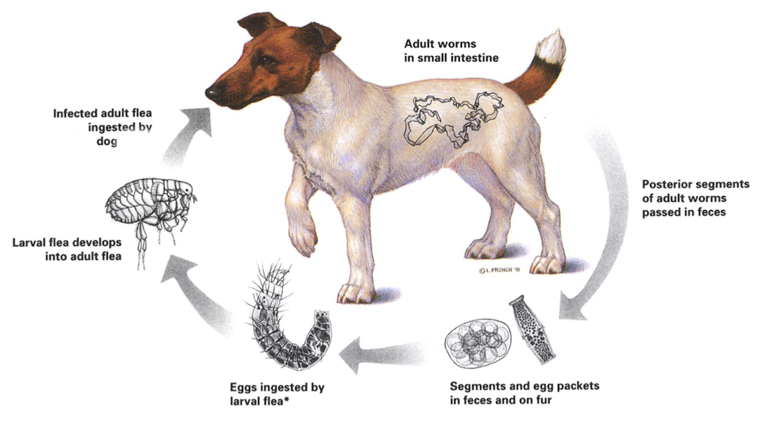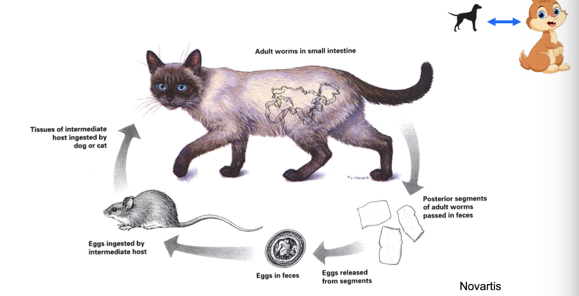 Praziquantel → D. caninum(eating fleas), T. pisiformis, E. multilocularis (eating rodents)