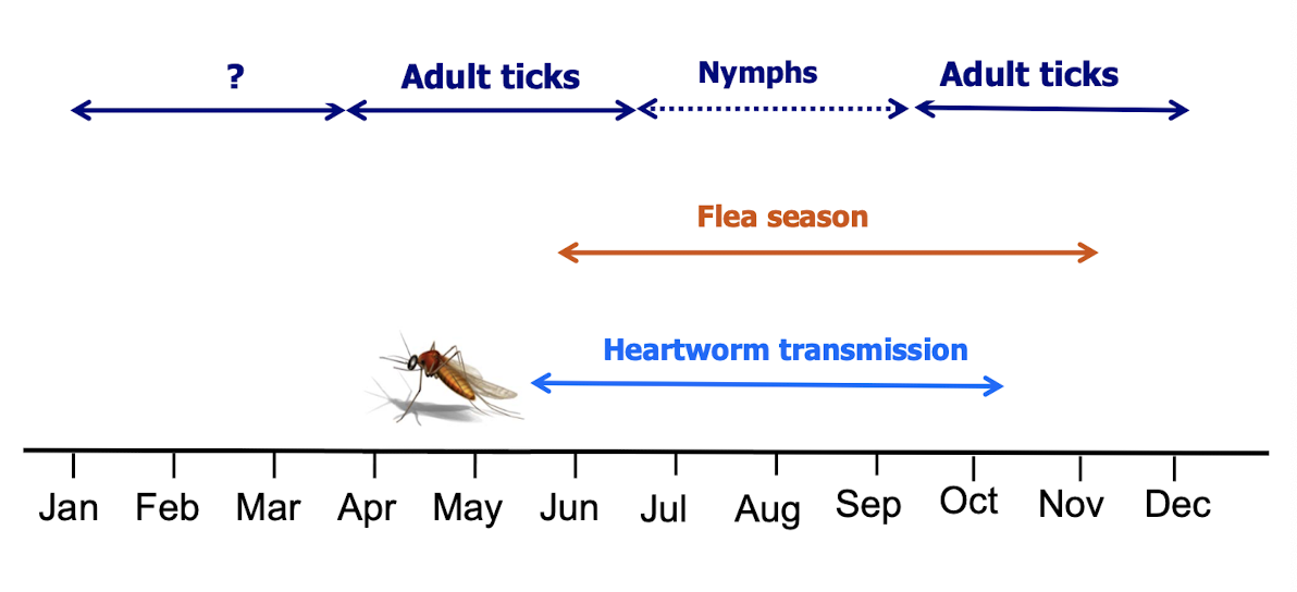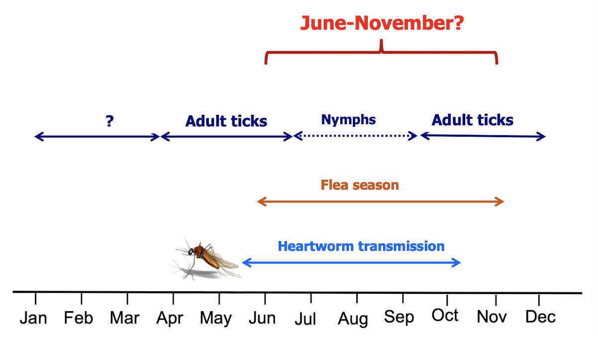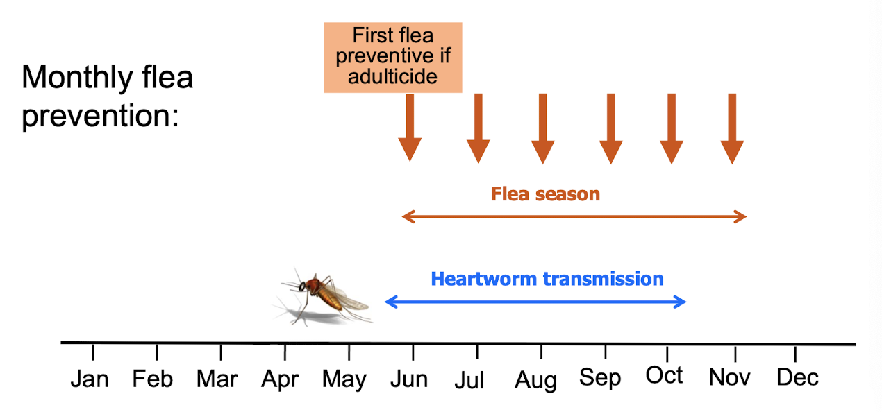 Flea season spans mainly spring through winter. First flea preventive should be given at the start of the season → June 1 if using monthly adulticides. Heartworm transmission overlaps seasonally