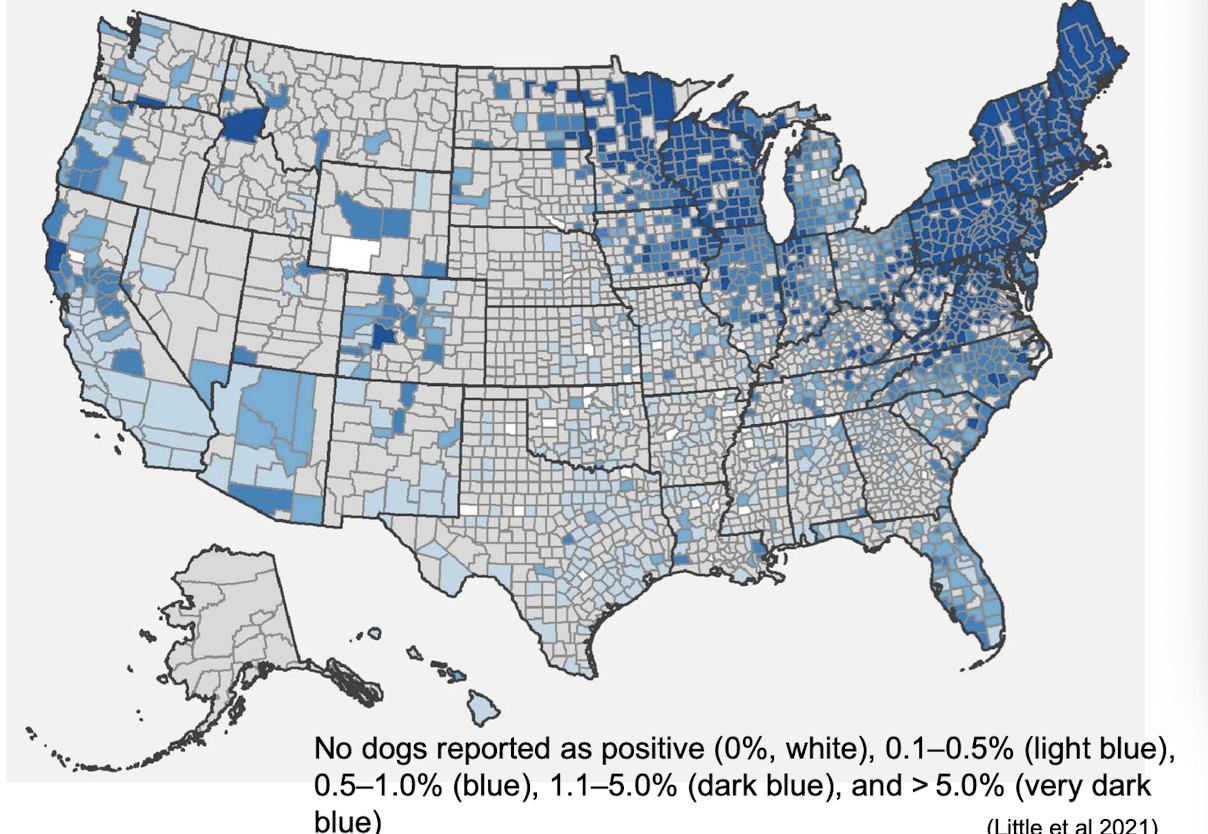 It shows county-level seropositivity of dogs for Borrelia burgdorferi from 2013–2019. Prevalence varies from 0% to >5%, highlighting the patchy nature of Lyme risk and the need for localized prevention decisions