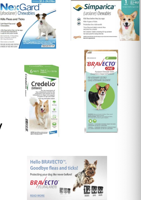 Monthly: afoxolaner (NexGard), sarolaner (Simparica), lotilaner (Credelio), Bravecto One