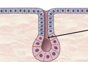 Entire cell becomes packed with secretory product and then bursts, Cells replaced by division of basal cells