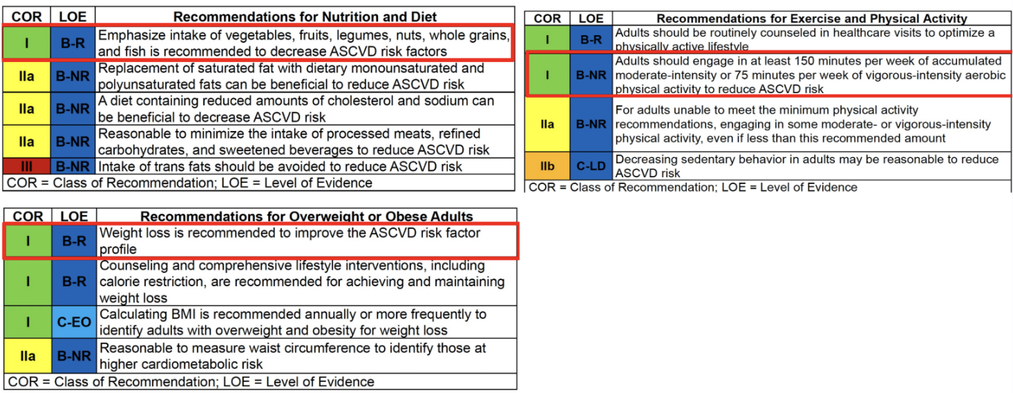 Important to intake vegetables, fruits, legumes, nuts, whole grains, and fish is recommended to decrease ASCVD risk factors