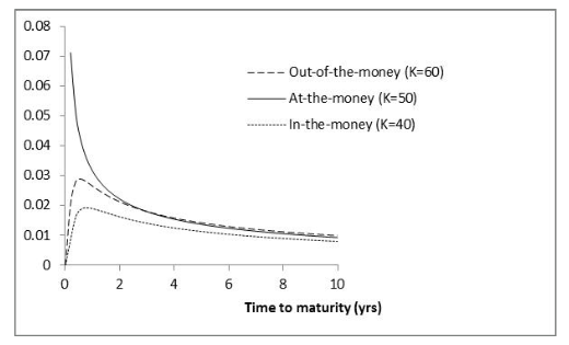 Variation of Gamma with Time to Maturity (S0=50, r=0, σ=25%, Figure 19.10)