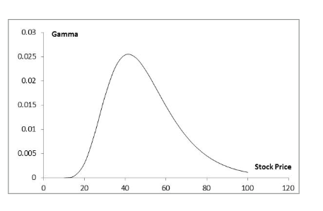 Gamma for Call or Put Option: (K=50, σ = 25%, r = 0%, T = 2, Figure 19.9)