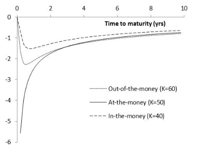 Variation of Theta with Time to Maturity (S0=50, r=0, σ=25%, Figure 19.6)