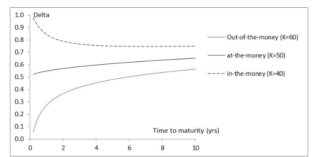 Variation of Delta with Time to Maturity(S0=50, r=0, σ=25%, Figure 19.4)
