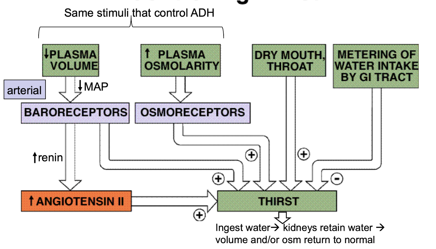 decreased plasma volume → decreased MAP → arterial baroreceptors → increased renin → increased angiotension II → thirst