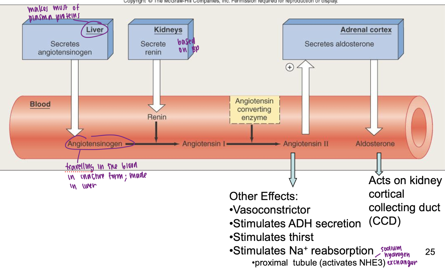 peptide generated in the plasma and tissue compartments; stimulates aldosterone secretion, Na reabsorption (proximal tubule via NHE3, Na+/H+ exchanger), thirst, ADH secretion, and vascoconstriction