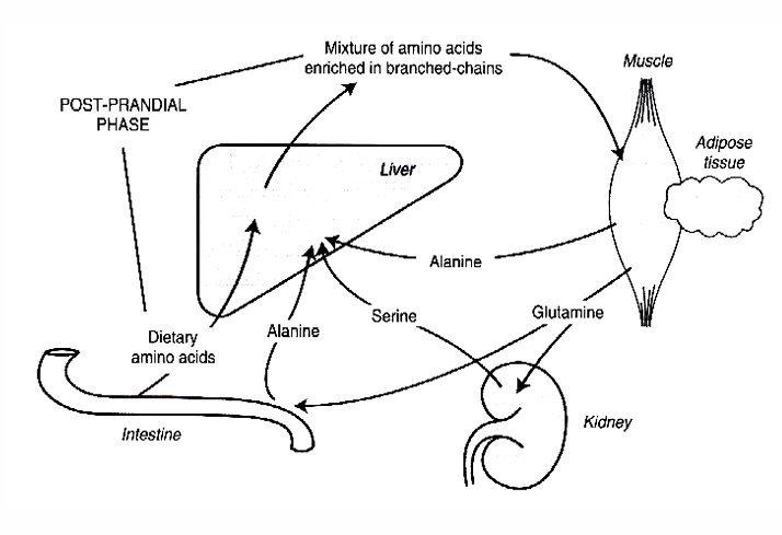 3) branched-chains AA leaving the liver (Val, Leu an Ileu) → skeletal muscle