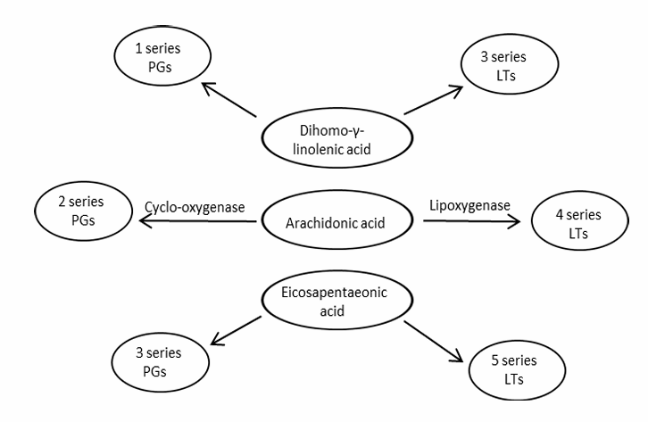 → PG = prostaglandines = mediate inflammation and pain → LT = leukotrienes = regulate function of white blood cells + stimulate contraction of smooth muscles | → PG → LT → DHA = docosa hexanoic acid C22:6\omega3 |
