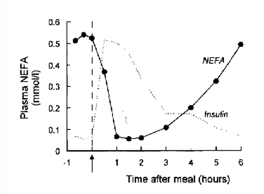 plasma NEFA concentration = inverse reflection of plasma glucose and insulin concentration