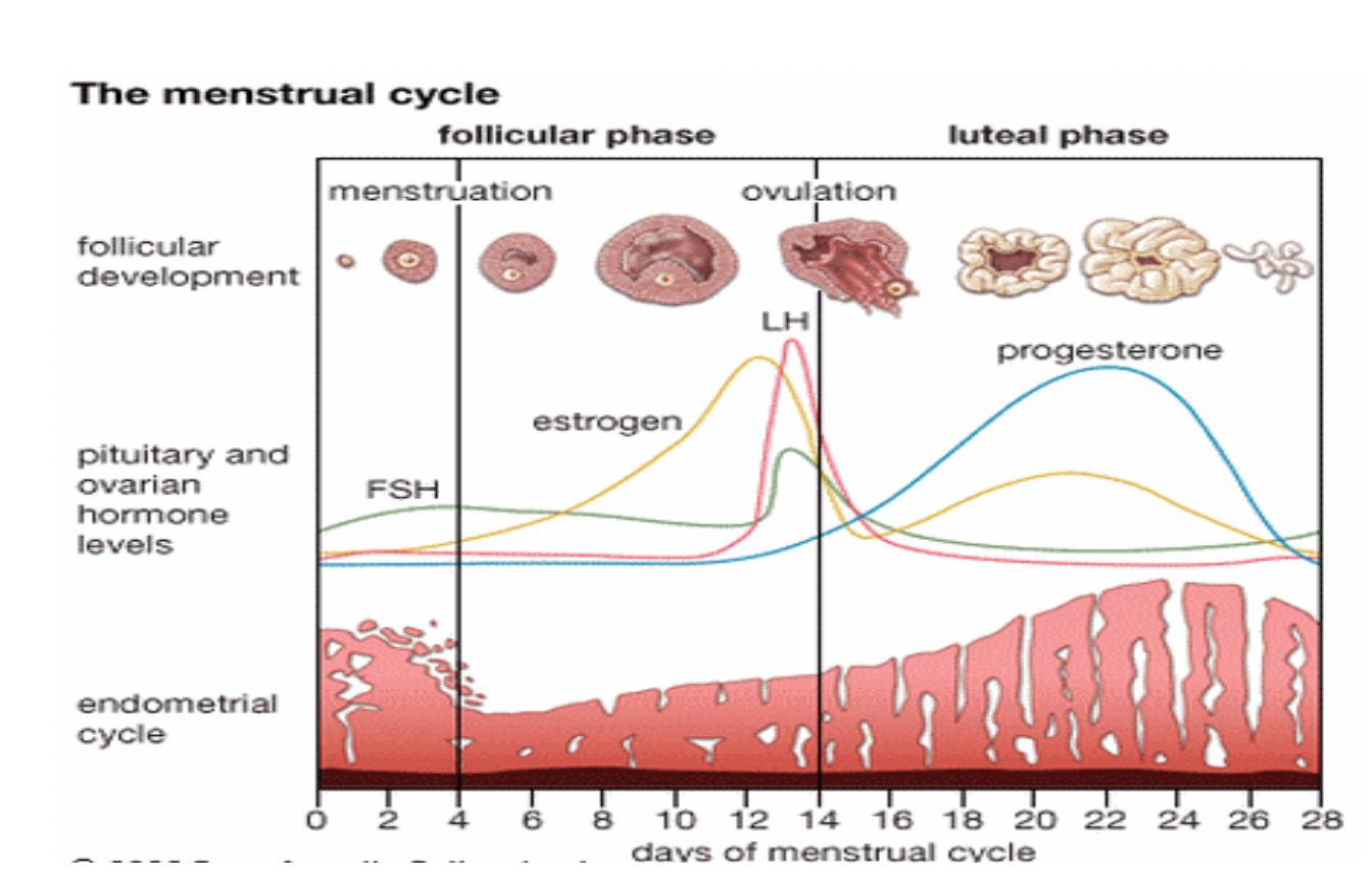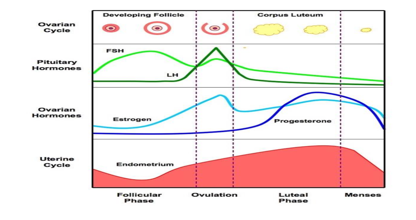 2 days before ovulation: ↑Estrogen secretion by graafian follicle