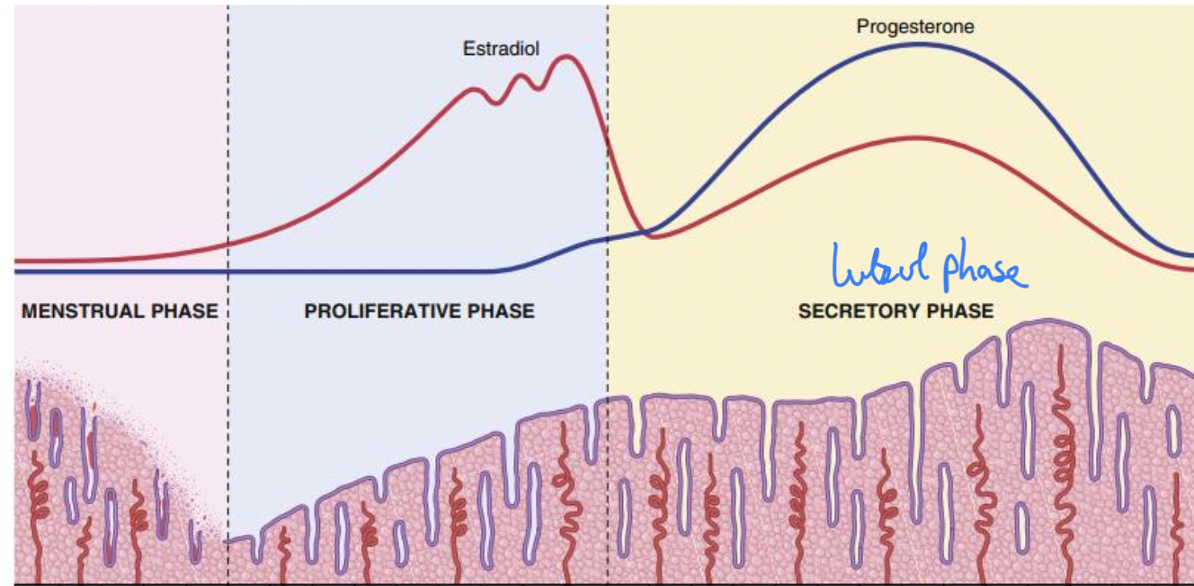 In postovulatory phase: ↑ progresterone secreted by corpus luteum reaching peak on Day 22. 2 days before next cycle ↓ secretion rate due to corpus luteum degeneration