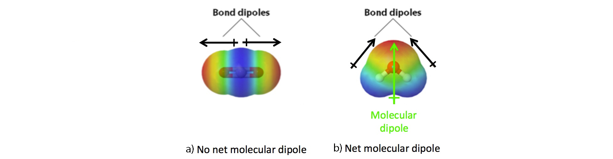 Molecule is asymmetrical (not linear and opposite from each other, but bent and/or going in the same direction)→ dipoles do not cancel.