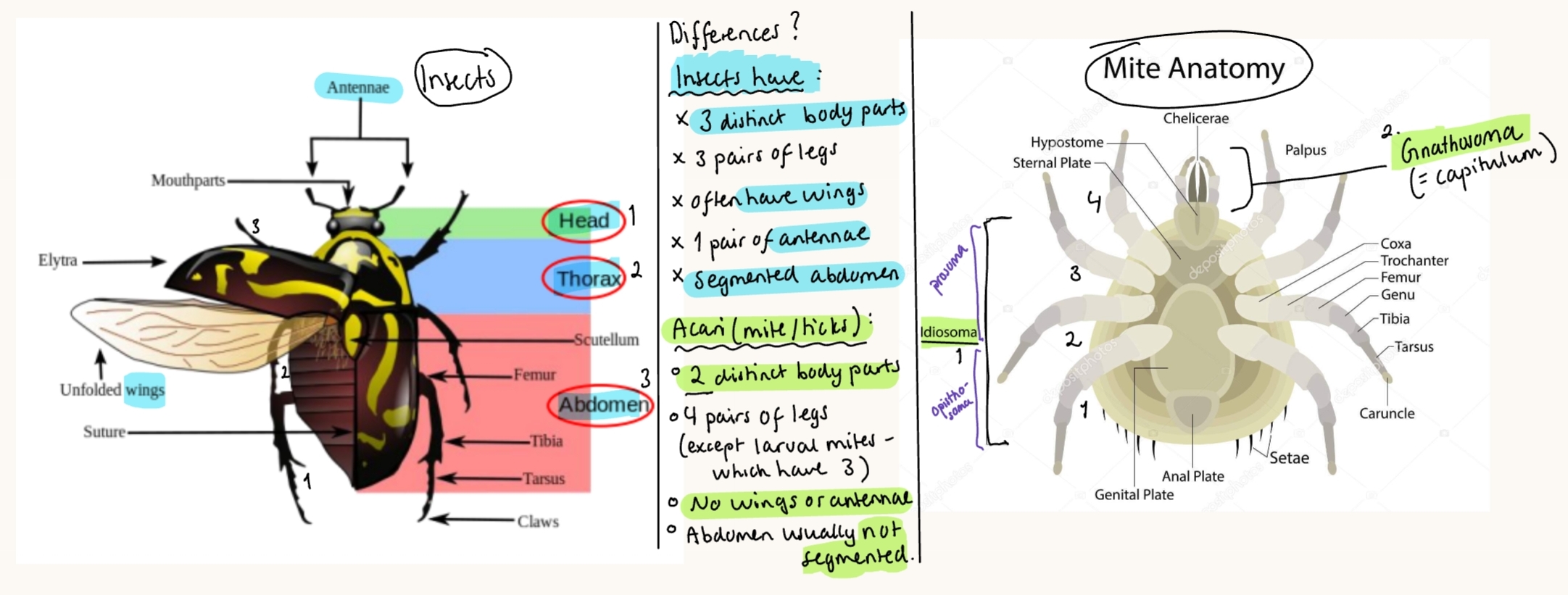 Arachnids (spiders) → cephalothorax/gnathosoma (head + chest fused) + abdomen/idiosoma