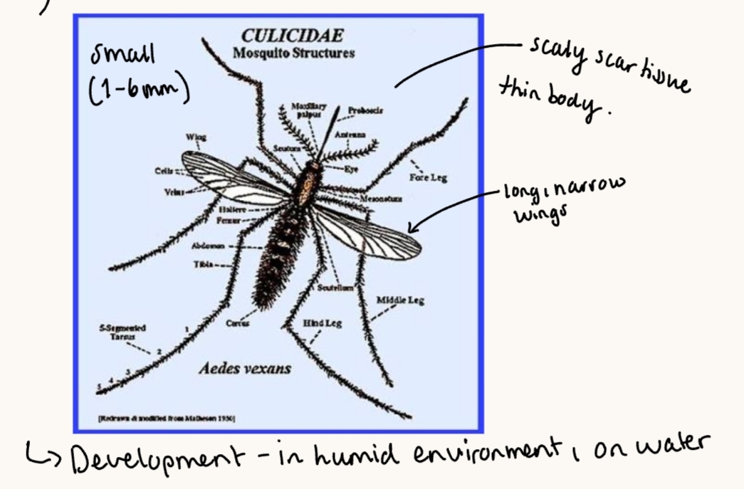 Subfam: anophelinae (genus: anopheles) & Culicinae (genus: aedes, culex - vectors for avian pox, filarial worms, equine encephalitis)