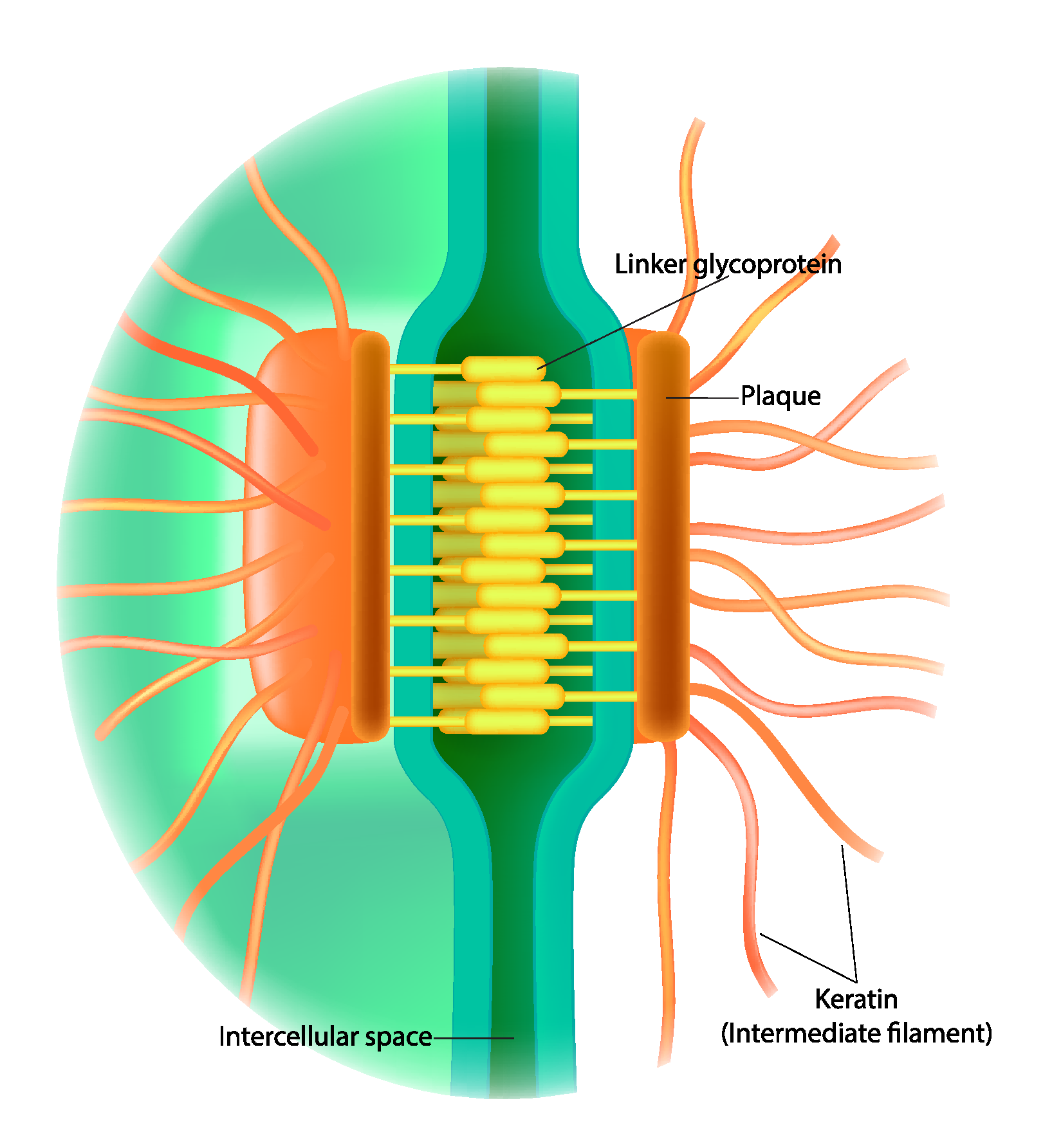 Intermediate filaments inside cells hold them together (think of the desmosome as a coupler that connects train cars together)