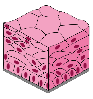 Multiple layers of cells, with topmost layer flat (squamous) while deeper layers can be cuboidal or columnar