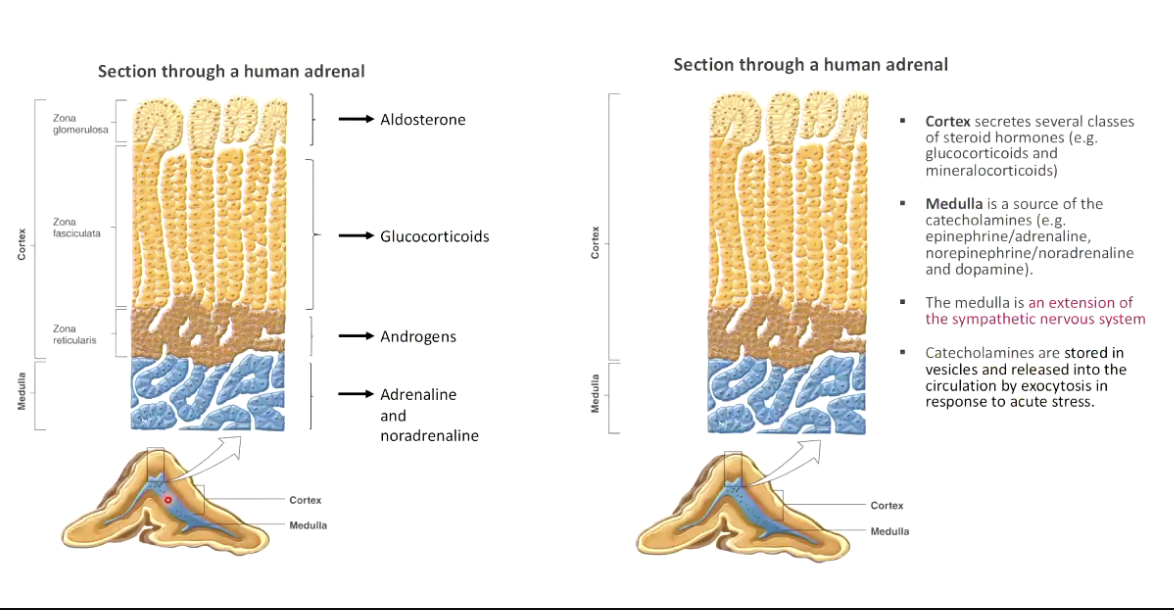 medulla ⇒ adrenaline and noradrenaline (catecholamines) are made here