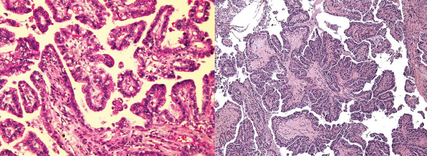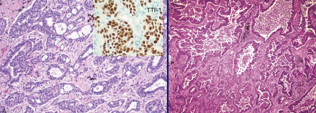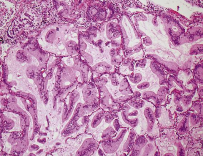 Lepídico, reviste la superficie de paredes alveolares, preservando arquitectura pulmonar