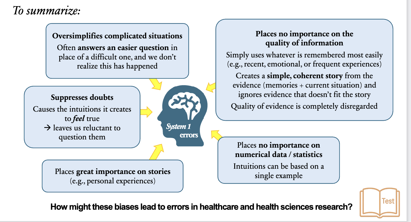 Intuitive biases can cause healthcare professionals or researchers to rely on personal experiences or vivid stories instead of data, leading to false conclusions. For example, a doctor might believe a treatment works because a few patients improved after using it, while ignoring statistical evidence showing the same recovery rate in untreated patients — an error caused by neglecting control groups and base rates.