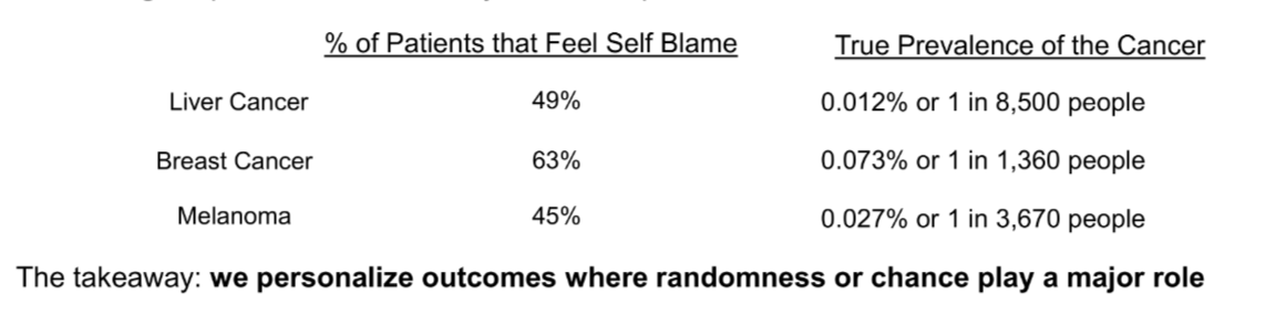 Many cancer patients believe their illness is caused by something they did, even though cancer often arises randomly or by chance.