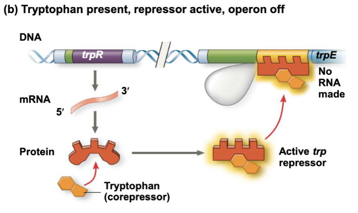 When tryptophan is present it will bind to the inactive repressor protein, causing it to become active. It will block the polymerase from making tryptophan because there is already some present. Tryptophan is a corepresser because its helping the repressor protein doing its job
