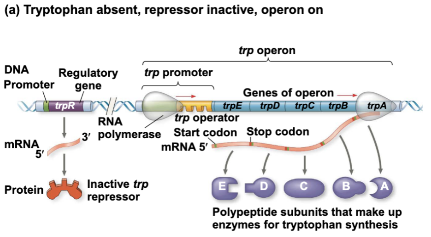 There are the five genes in the operon to make enzymes in order to make tryptophan. When the trp operon is produced the repressor is inactive. The repressor is present and floating around, its not doing anything. So the polymerase can travel through to get a transcription and have it translated. The repressor is inactive because enzymes are needed to make the tryptophan, it only activated when there are some present in the environment