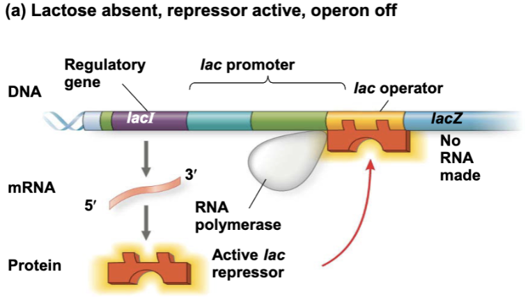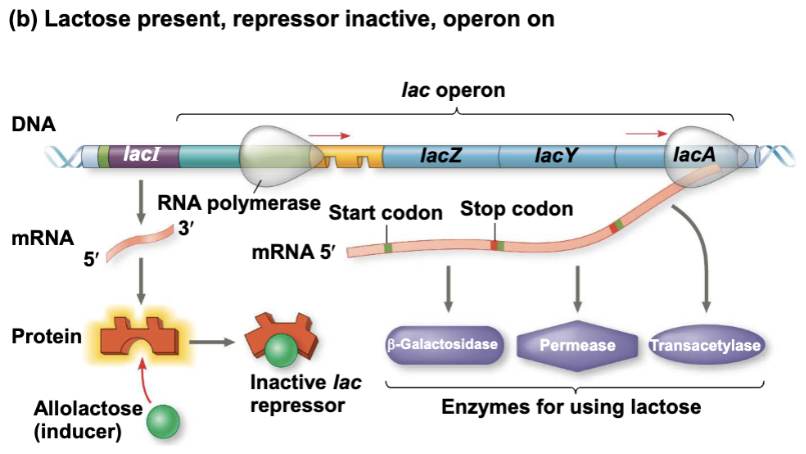 When there is lactose it's going to bind to the regulatory protein to turn the repressor inactive. This will allow transcription and it will produce the enzymes needed for utilizing lactose. Known as an inducer because it is causing the formation of new enzymes