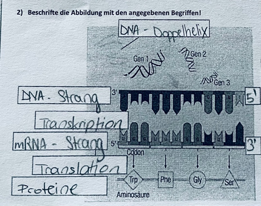 Die Basensequenz der mRNA wird in eine bestimmte Abfolge von Aminosäuren (= Aminosäuresequenz) eines Proteins übersetzt.
