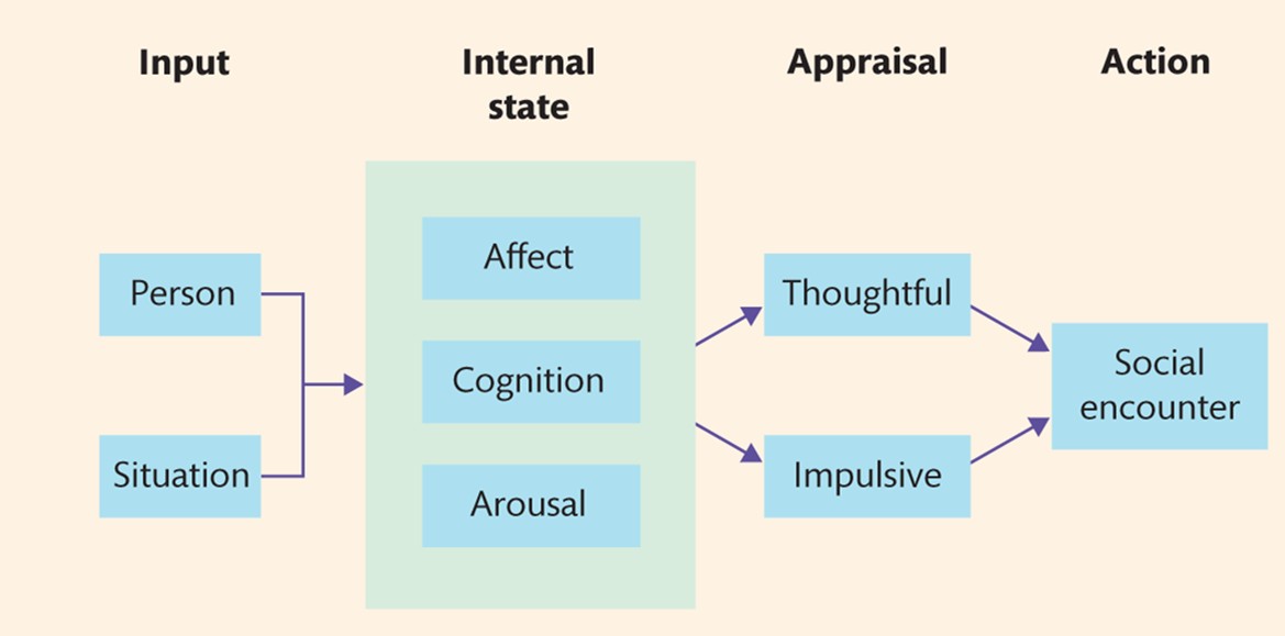 person/situation variables can affect our moods/emotions, aggressive thoughts and arousal which affects our appraisals → alters the likelihood of aggression
