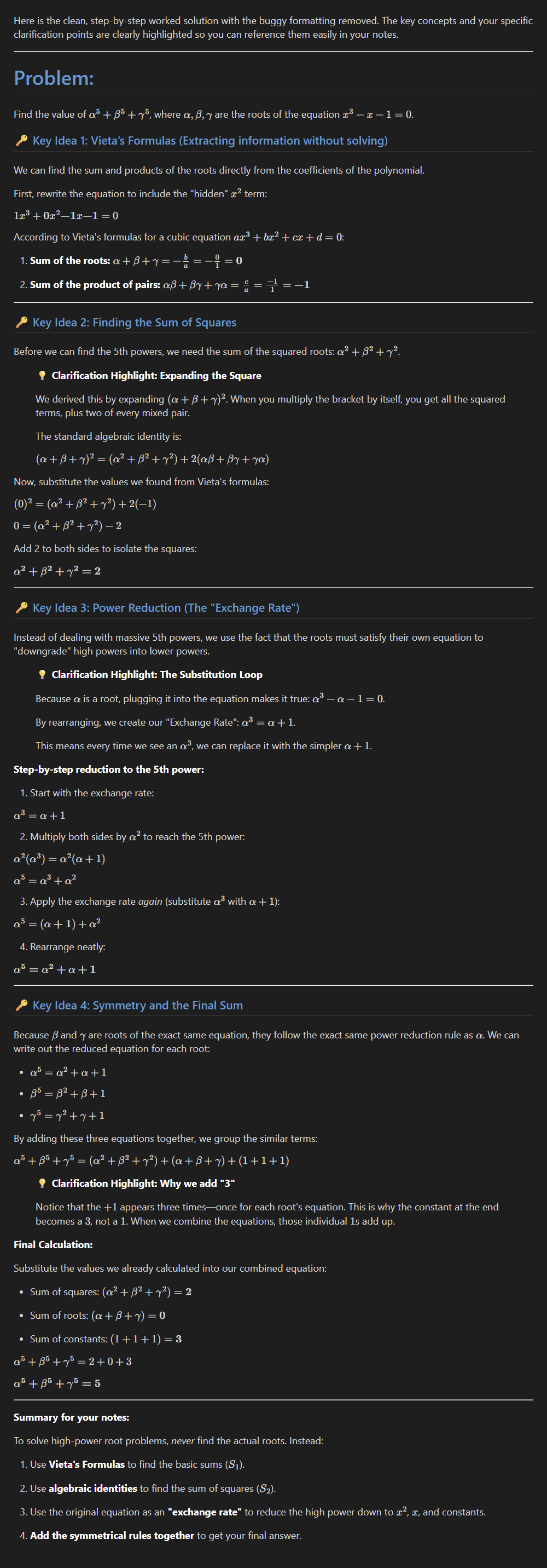 The roots of x^3-x-1=0 are \alpha, \beta, \gamma. Find the value of \alpha^5 + \beta^5 + \gamma^5.