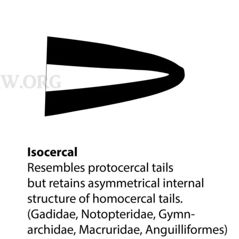 Similar to protocercal but retains asymmetrical internal structure (while like)