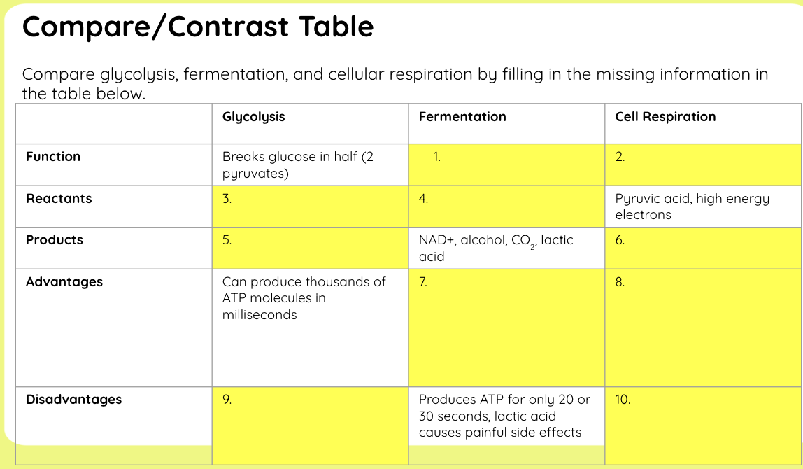 Glycolysis is the first step in a series of reactions in which glucose is converted into 2 pyruvate molecules. This releases energy to generate ATP from ADP. It also converts NAD+ into NADH. NADH is a coenzyme that can accept electrons. It will transport these to the electron transport chain.