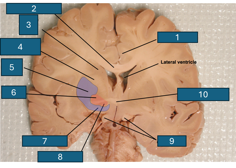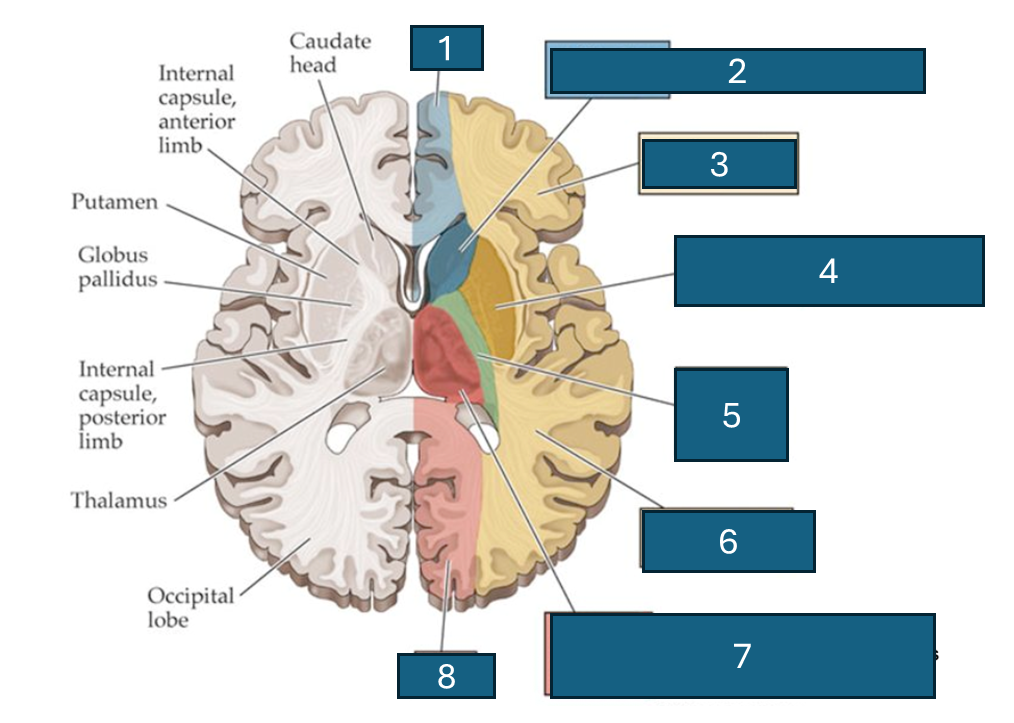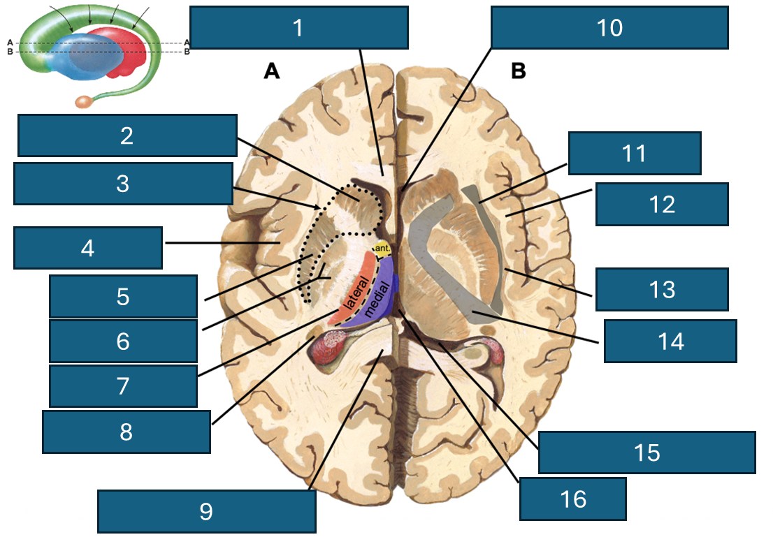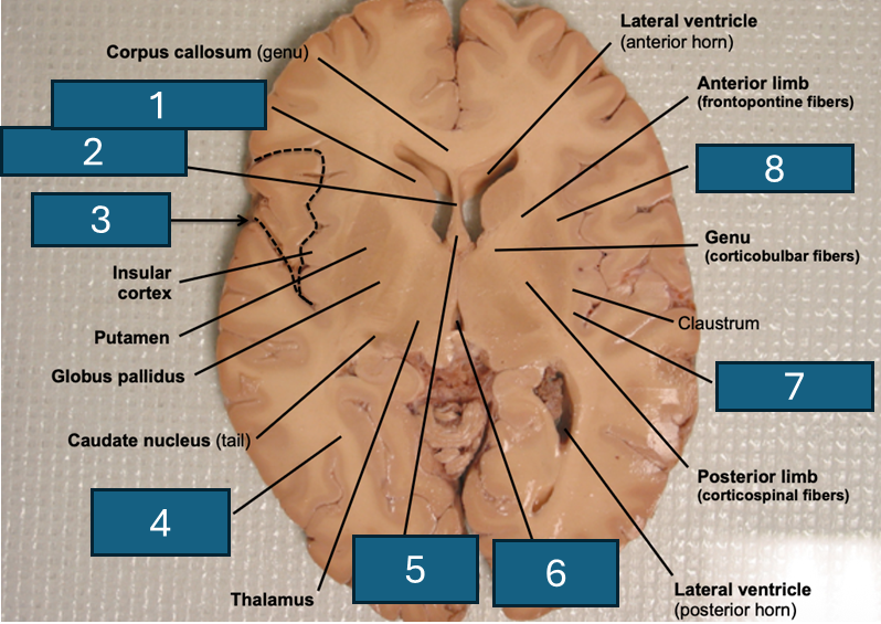 corpus callosum genu, caudate nucleus head, corpus striatum, insular cortex, putamen, globus pallidus, thalamus, caudate nucleus tail, corpus callosum splenium, lateral ventricle anterior horn, external capsule, extreme capsule, claustrum, internal capsule, lateral ventricle inferior horn, III