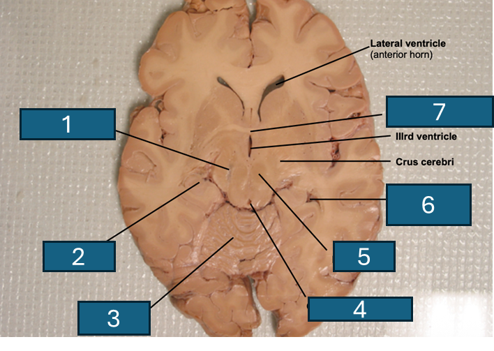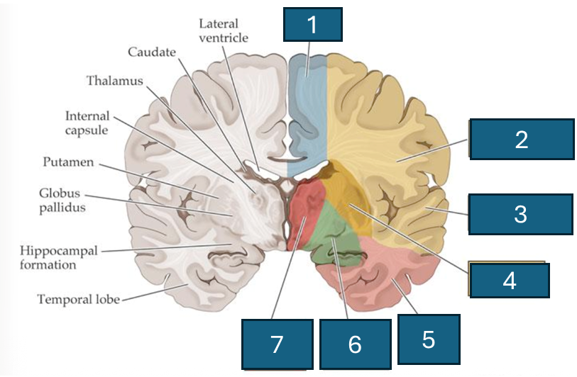 caudate nucleus head, septum pellucidum, lateral fissure, optic radiation, fornix, III, extreme capsule, external capsule