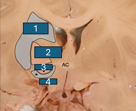 cingulate gyrus, corpus callosum genu, caudate nucleus head, internal capsule anterior limb, putamen, globus pallidus, ventral striatum, ventral pallidum, optic nerves, anterior commissure