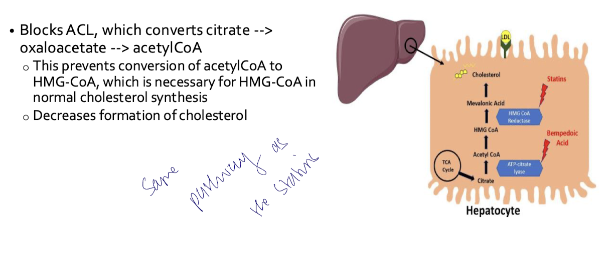 It blocks ACL; which prevents conversion of acetylCoA to HMG-CoA; decreasing formation of cholesterol.