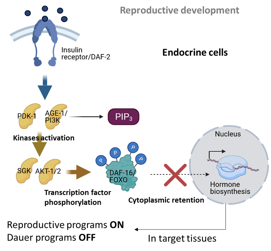 insulin (when food is around) activates DAF2 —> activates kinase signalling cascade which activates foxo TF