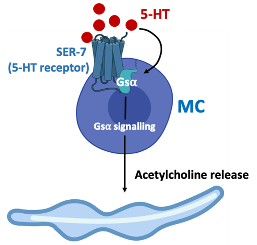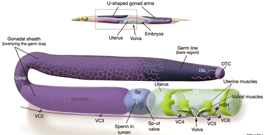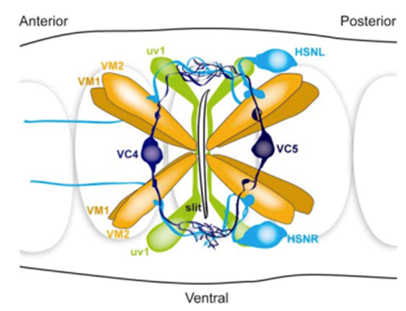 AIA and AIY neurons in nose express flp1 which signals to HSN which controls vulval muscle cells to adapt physiology