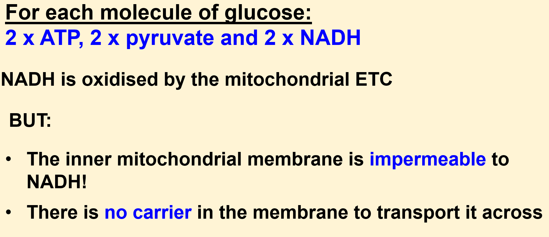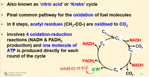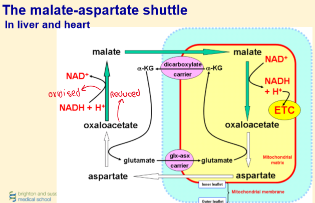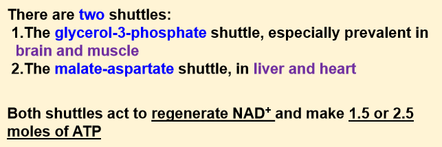 Re-oxidation (recycling) of NADH and FADH2 is via the respiratory chain in the mitochondria