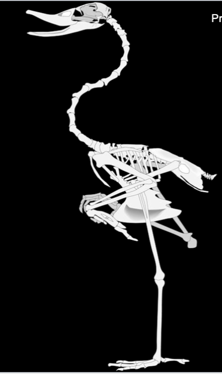 large prominent sternum, fused wrist hand bones, long wading legs, flat broad duck-like bill, 4-toes foot
