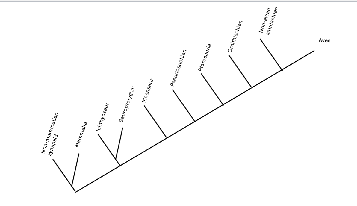 Aves, Ichthyosauria, Mosasauroidea, Non-avian saurischian = therapod or sauropod, ornithischia, pseudosuchia, pterosauria, sauropterygia