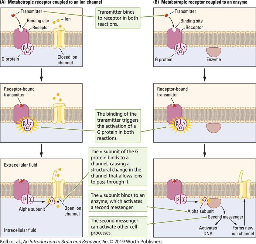 2 classes of receptors (metabotropic receptors) - G protein (second messenger)