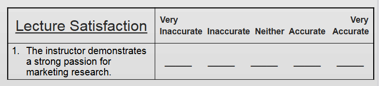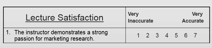 lecture satisfaction on a scale of 1 - 5, 1 being very dissatisfied and 5 being very satisfied. intervals are equal and meaningful.