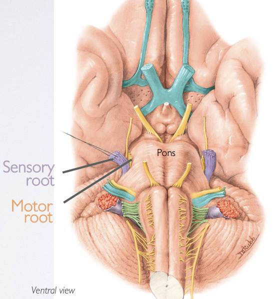 → emerges from the lateral surface of the pons of the midbrain via 2 roots