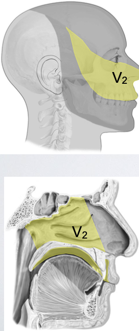 List all the regions the CN V2 provides sensory innervation to.