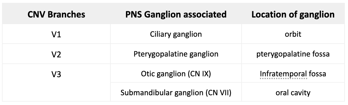 All 3 divisions (V1, V2 & V3) are associated with parasympathetic ganglia and help distribute parasympathetic fibers to their targets.